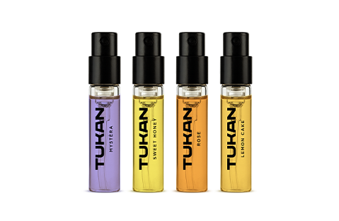 Discover your signature scent with the Tukan Fragrance Signature Set. This exclusive discovery kit includes four 3 ml perfumes – Lemon Cake, Sweet Honey, Rose, and Mystèra (created in collaboration with Ehab Ajami).